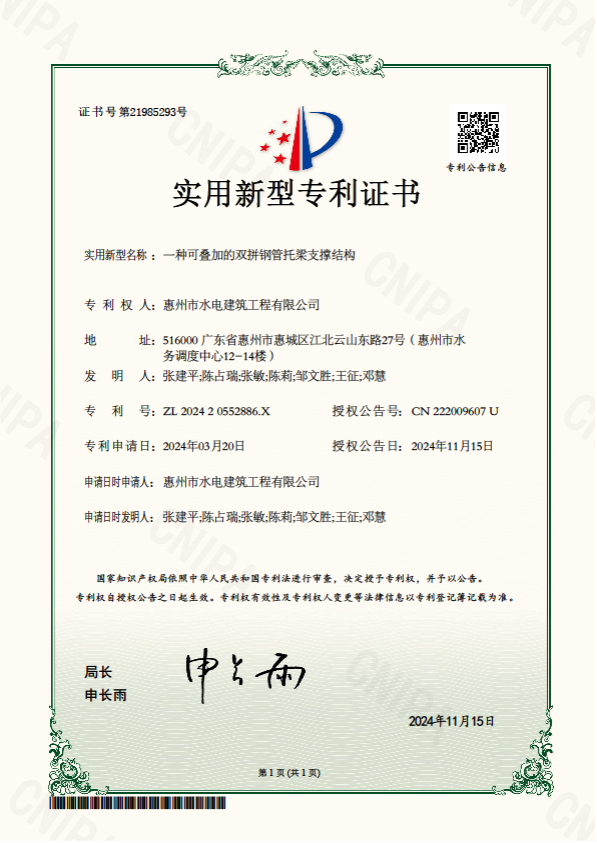 近日,由我司自主研發(fā)的“一種可疊加的雙拼鋼管托梁支撐結(jié)構(gòu)”獲國(guó)家知識(shí)產(chǎn)權(quán)局授予實(shí)用新型專(zhuān)利證書(shū),標(biāo)志著公司在創(chuàng)新發(fā)展的道路上又向前邁進(jìn)堅(jiān)實(shí)一步。......