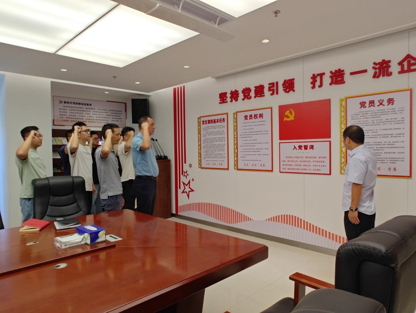 活動(dòng)最后,在黨支部書(shū)記的領(lǐng)誓下,全體黨員面向鮮紅的中國(guó)共產(chǎn)黨黨旗,舉起右拳莊嚴(yán)宣誓:“我志愿加入中國(guó)共產(chǎn)黨,擁護(hù)黨的綱領(lǐng),遵守黨的章程,履行黨員義務(wù)……”鏗鏘有力的誓言回蕩在活動(dòng)現(xiàn)場(chǎng),不僅是對(duì)入黨初心的重溫,更是對(duì)傳承抗戰(zhàn)精神、踐行使命擔(dān)當(dāng)?shù)泥嵵爻兄Z。黨員們表示,將以此次主題黨日活動(dòng)為契機(jī),牢記歷史、不負(fù)韶華,在施工一線攻堅(jiān)克難、勇挑重?fù)?dān),以實(shí)際行動(dòng)踐行入黨誓詞,讓偉大抗戰(zhàn)精神在新時(shí)代水電建筑征程中煥發(fā)光彩。